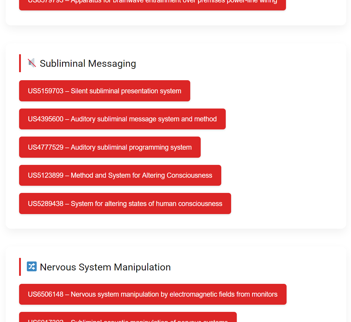 "This page documents a series of patents related to technologies that manipulate brain activity, perception, or the nervous system. Many of these patents cover auditory microwave effects (like the Frey Effect), silent subliminal messaging, and brain wave manipulation."